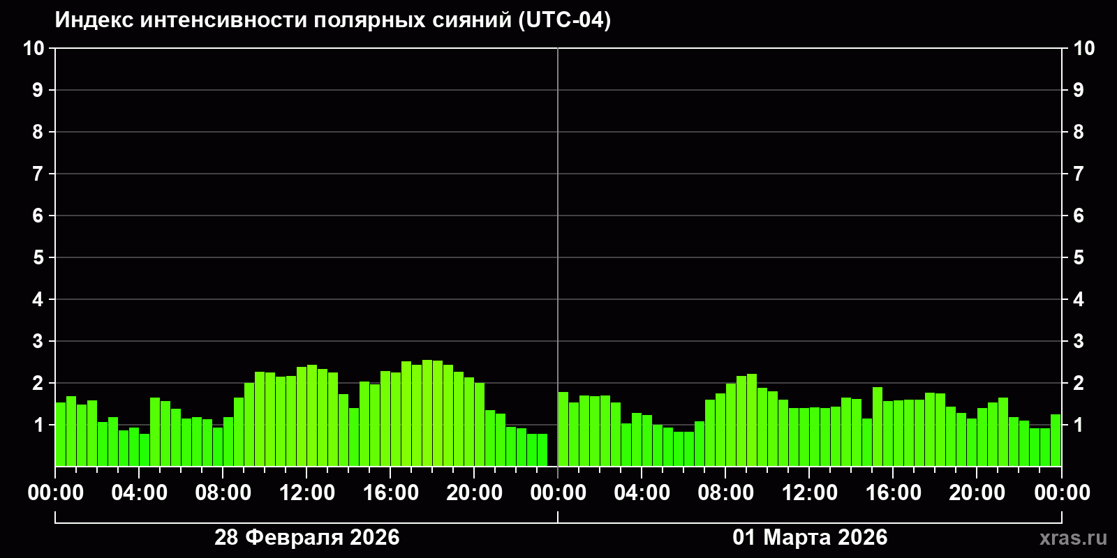 Изменения индекса интенсивности полярных сияний с 2026-02-28 по 2026-03-01 по местному времени