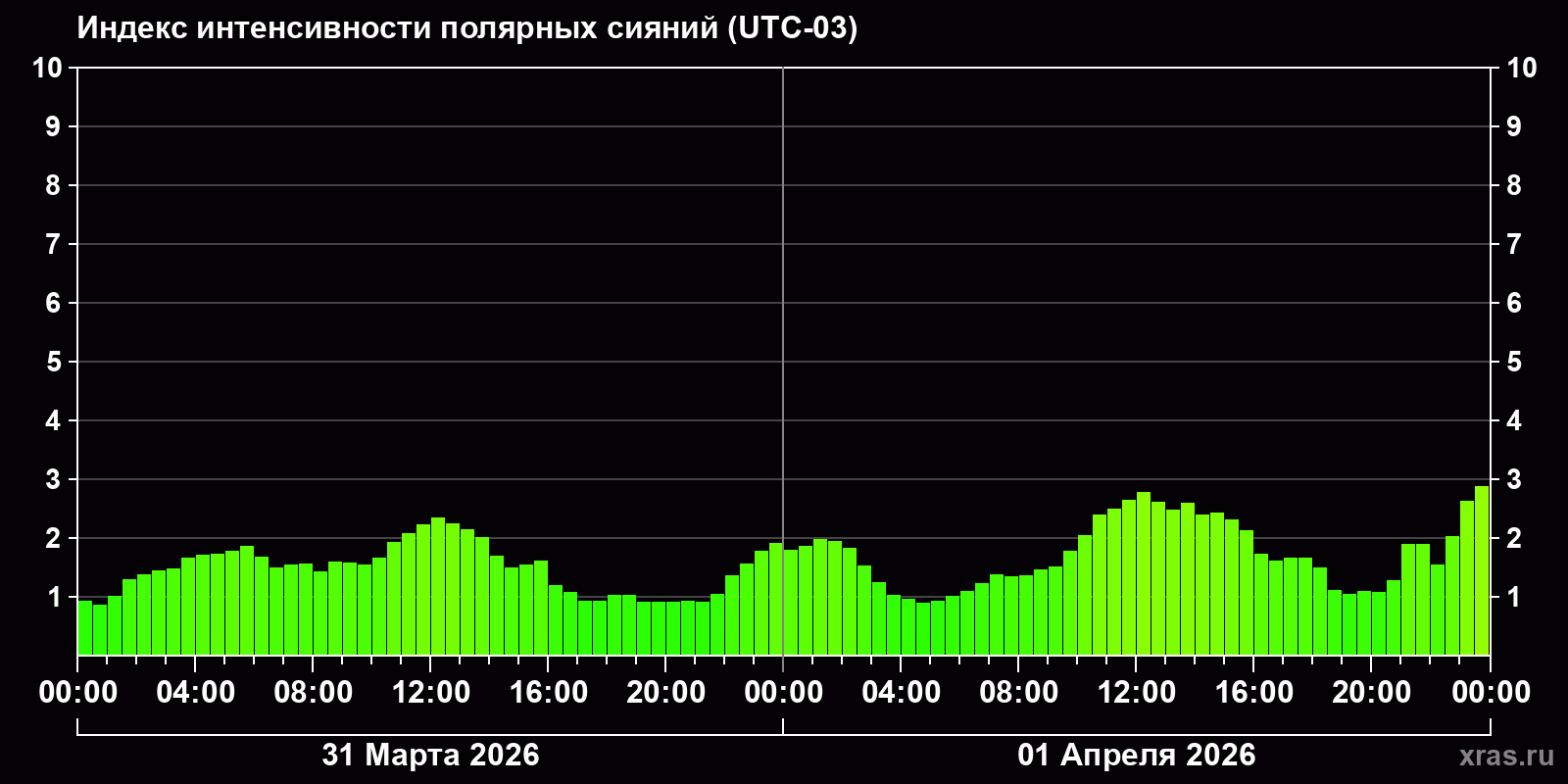 Изменения индекса интенсивности полярных сияний с 2026-03-31 по 2026-04-01 по местному времени