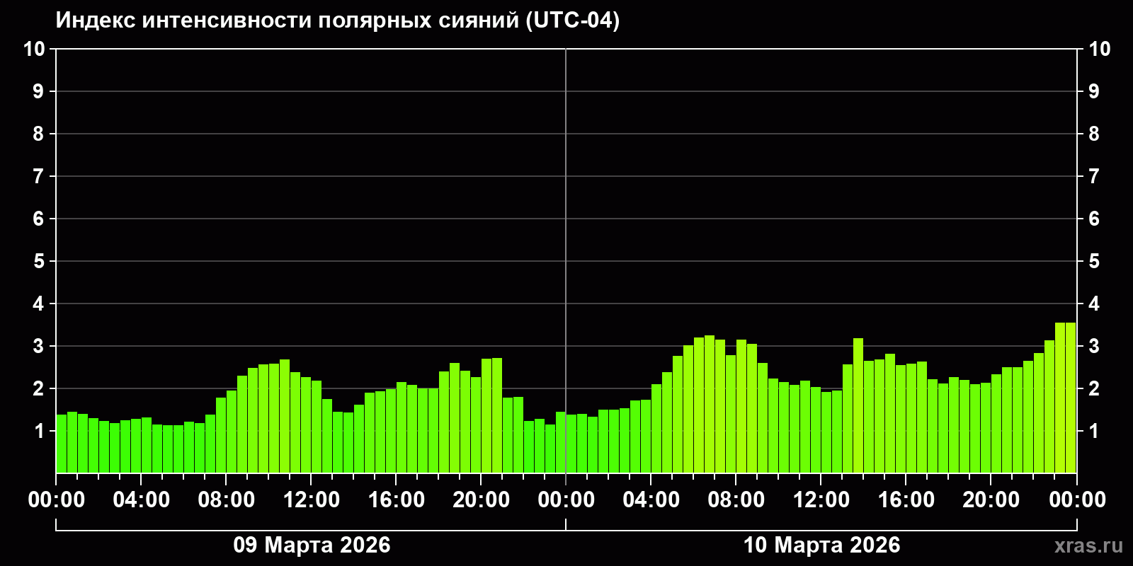 Изменения индекса интенсивности полярных сияний с 2026-03-09 по 2026-03-10 по местному времени
