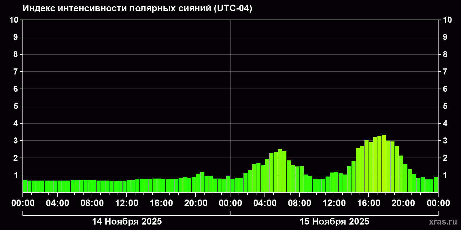 Изменения индекса интенсивности полярных сияний с 2025-11-14 по 2025-11-15 по местному времени