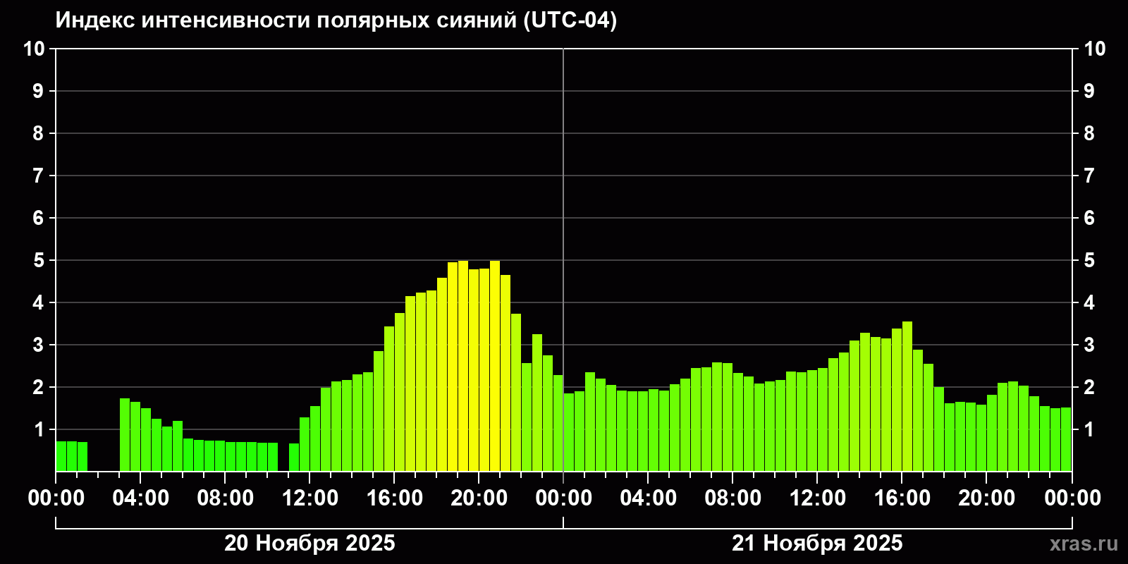 Изменения индекса интенсивности полярных сияний с 2025-11-20 по 2025-11-21 по местному времени