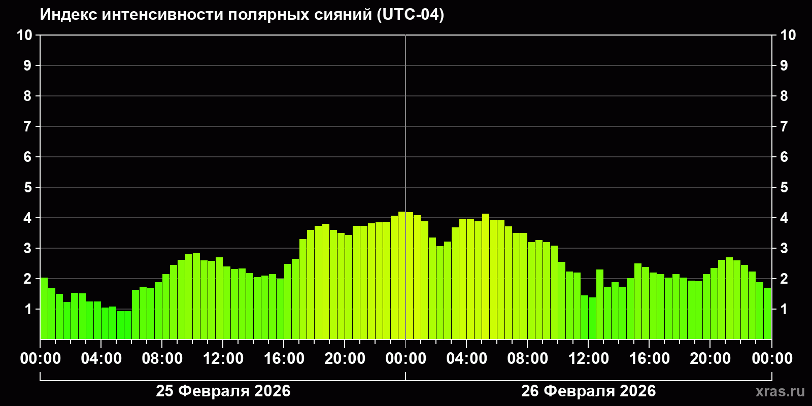 Изменения индекса интенсивности полярных сияний с 2026-02-25 по 2026-02-26 по местному времени