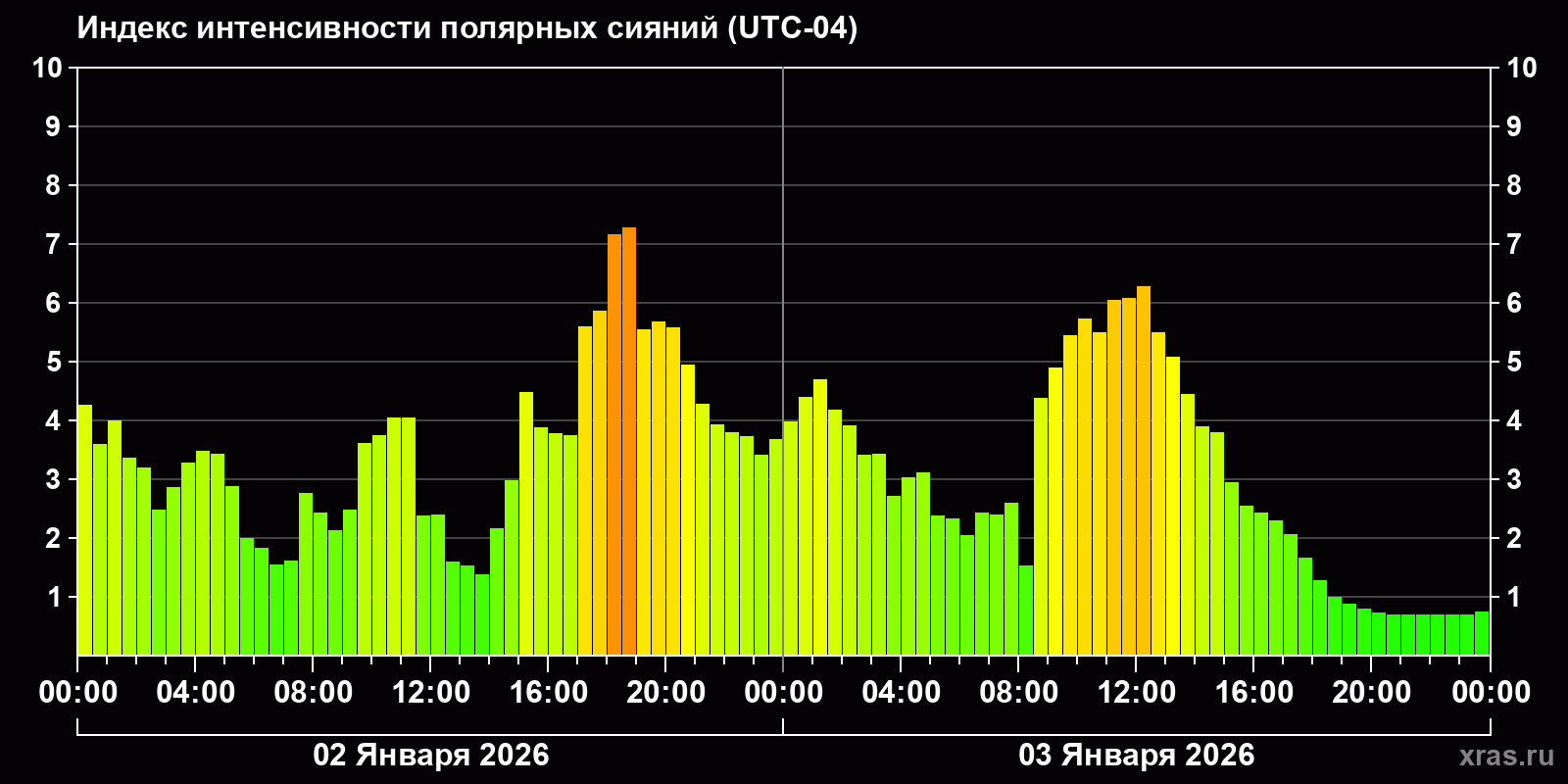 Изменения индекса интенсивности полярных сияний с 2026-01-02 по 2026-01-03 по местному времени