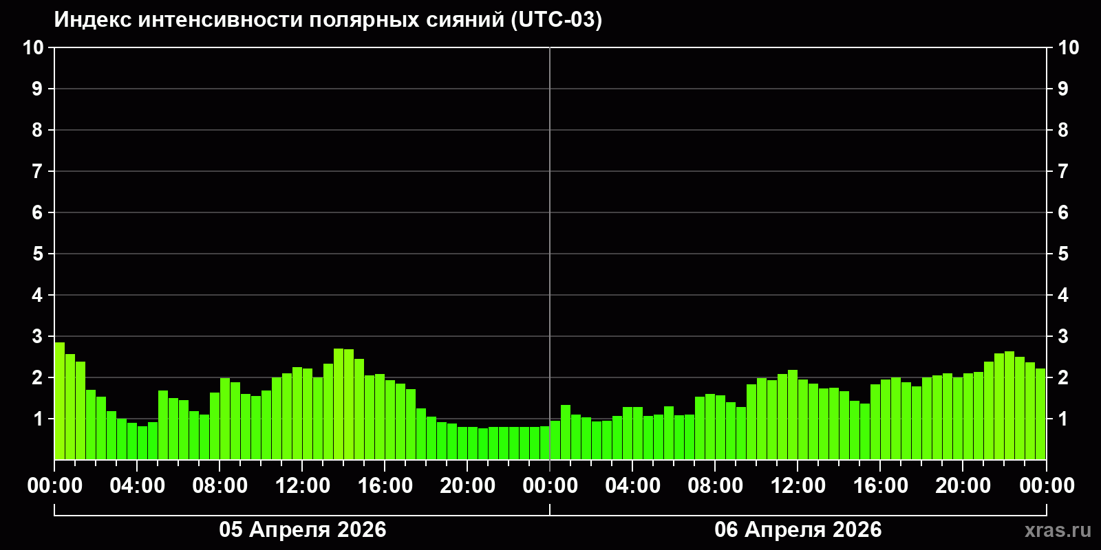 Изменения индекса интенсивности полярных сияний с 2026-04-05 по 2026-04-06 по местному времени