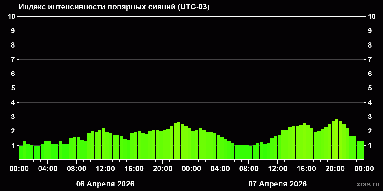 Изменения индекса интенсивности полярных сияний с 2026-04-06 по 2026-04-07 по местному времени