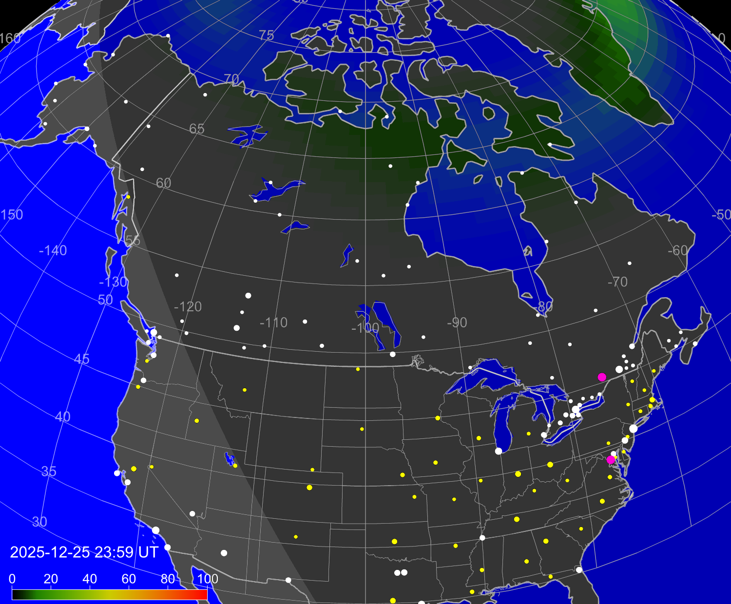 Вероятность полярных сияний в городах США