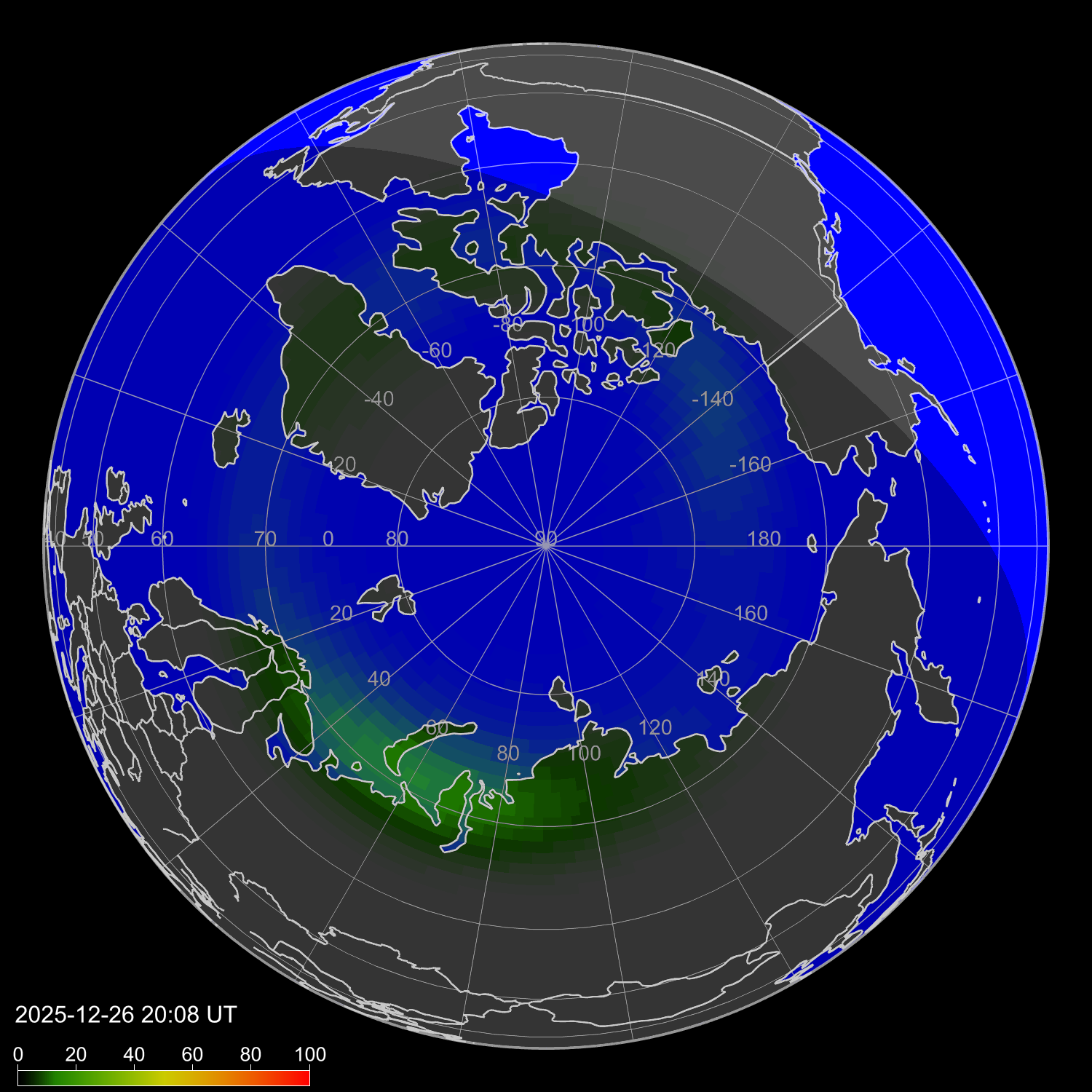 Индекс интенсивности полярных сияний и теоретически возможная широта наблюдений для ночного времени в западном полушарии