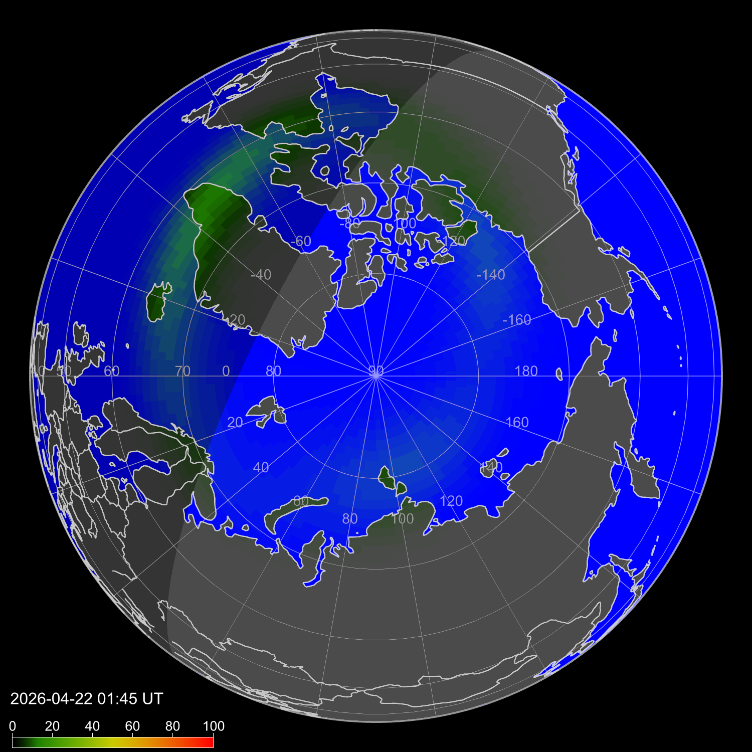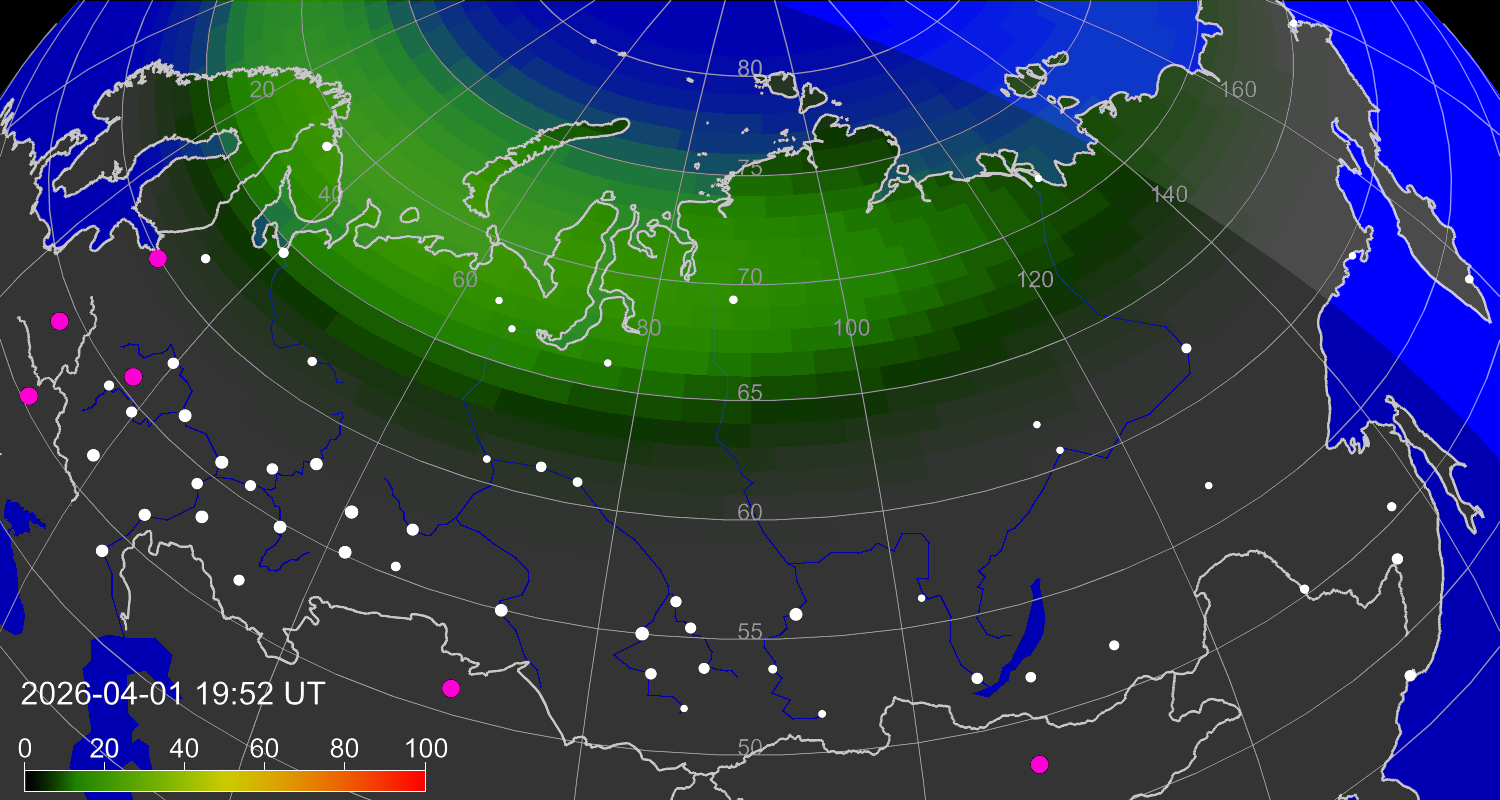 Индекс интенсивности полярных сияний и теоретически возможная широта наблюдений для ночного времени в восточном полушарии