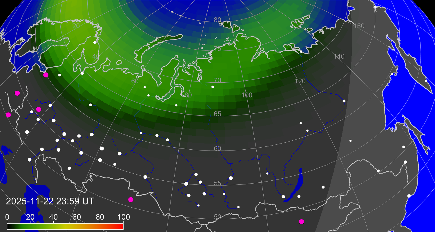 Изменения и часовой прогноз индекса интенсивности полярных сияний с 2025-11-22 по 2025-11-23
