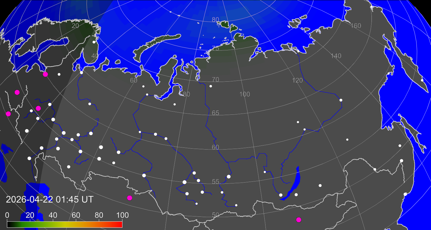 Вероятность полярных сияний в городах Российской Федерации
