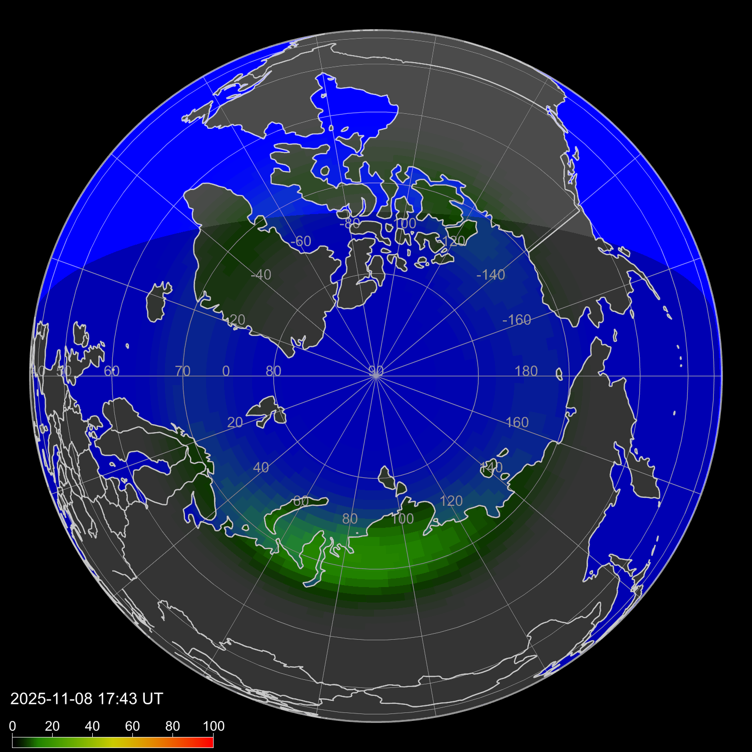 Изменения и часовой прогноз индекса интенсивности полярных сияний с 2025-11-07 по 2025-11-08