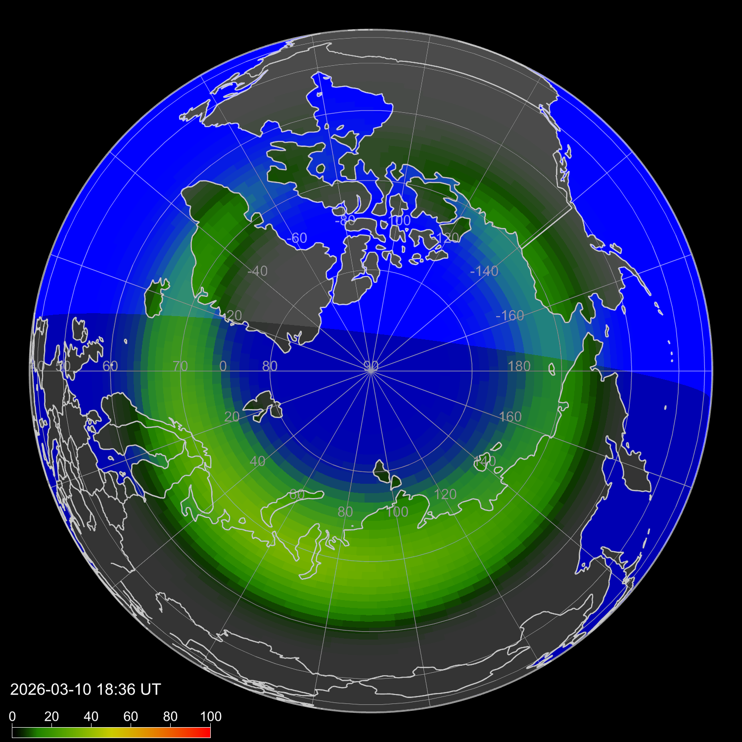 Изменения и часовой прогноз индекса интенсивности полярных сияний с 2026-03-09 по 2026-03-10