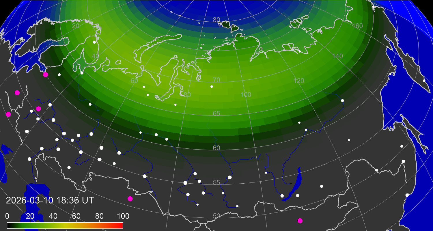 Индекс интенсивности полярных сияний и теоретически возможная широта наблюдений для ночного времени в восточном полушарии
