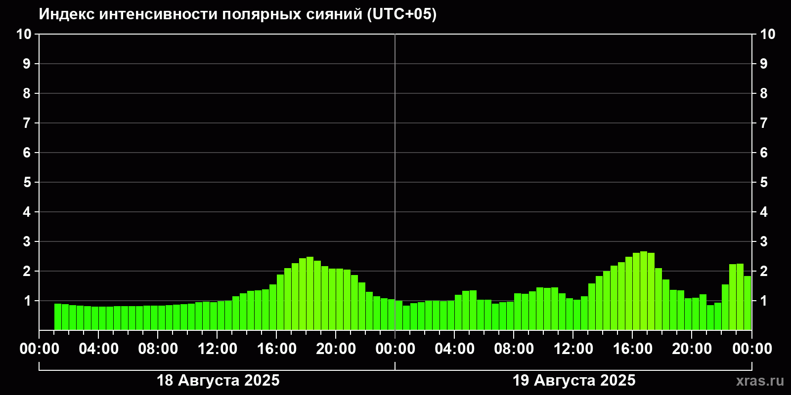 Изменения индекса интенсивности полярных сияний с 2025-08-18 по 2025-08-19 по местному времени