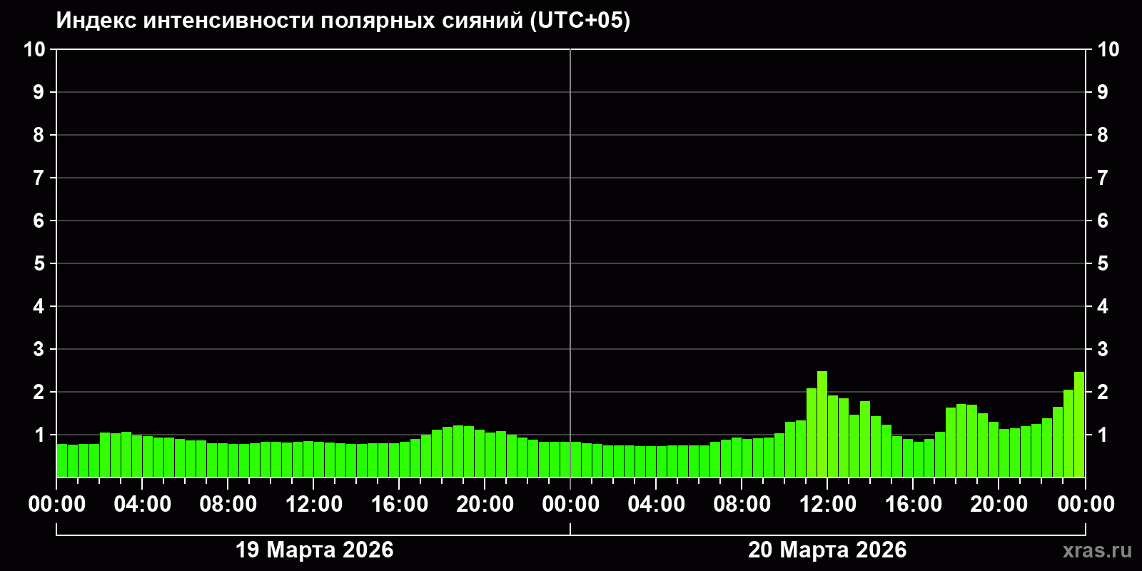 Изменения индекса интенсивности полярных сияний с 2026-03-19 по 2026-03-20 по местному времени