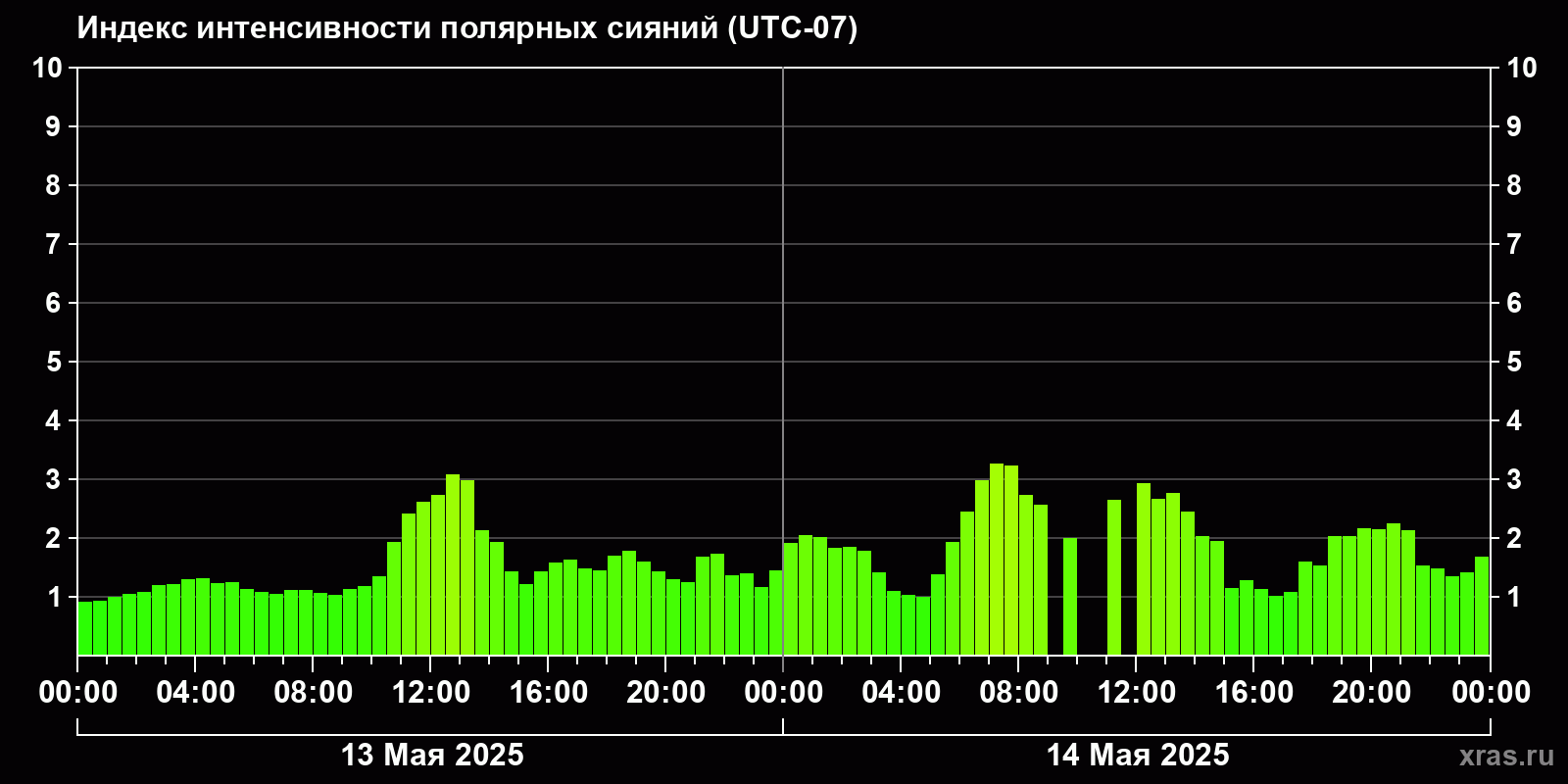 Изменения индекса интенсивности полярных сияний с 2025-05-13 по 2025-05-14 по местному времени