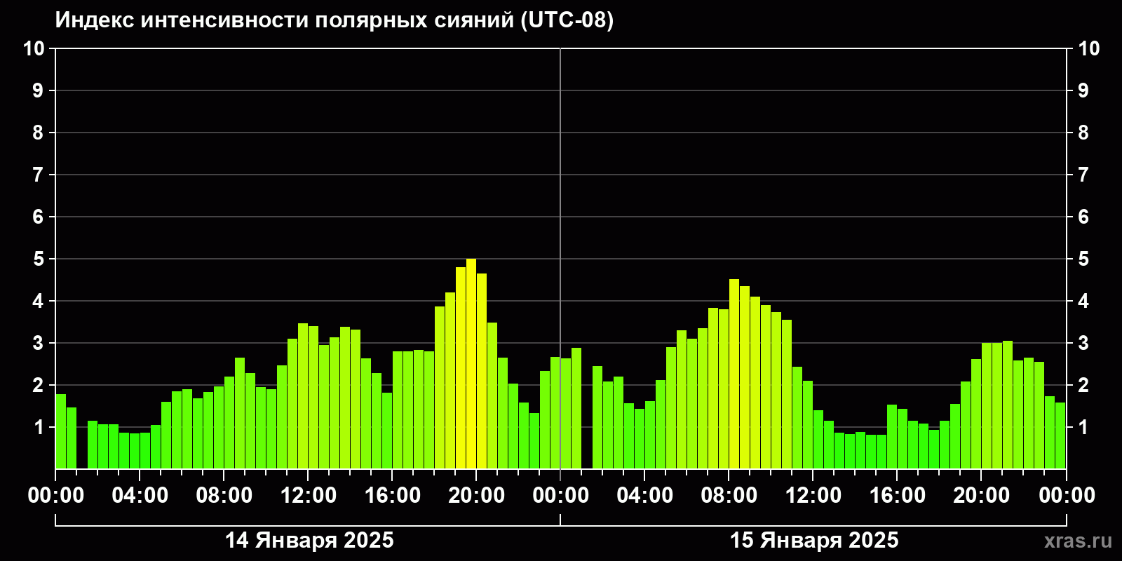 Изменения индекса интенсивности полярных сияний с 2025-01-14 по 2025-01-15 по местному времени