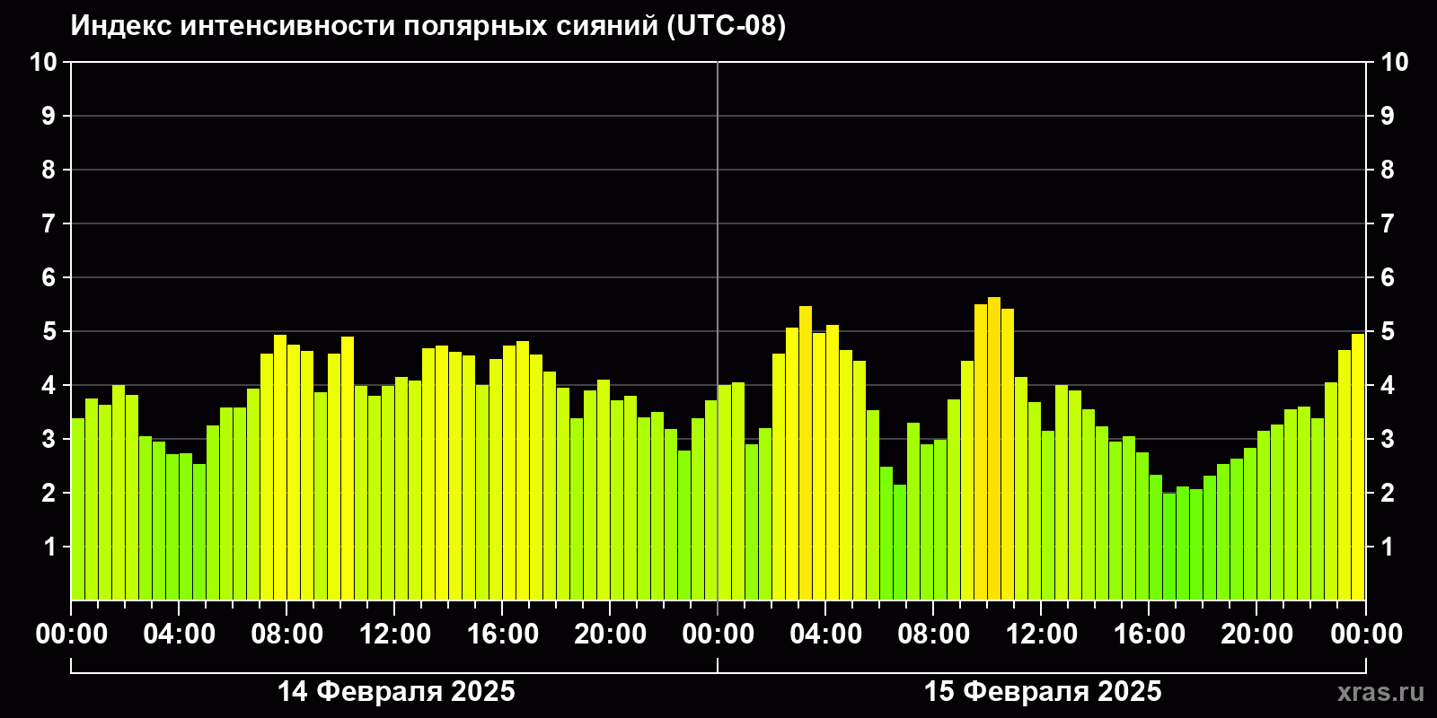 Изменения индекса интенсивности полярных сияний с 2025-02-14 по 2025-02-15 по местному времени