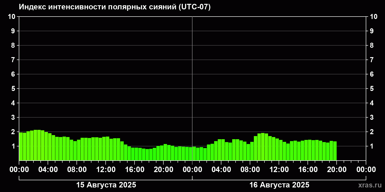 Изменения индекса интенсивности полярных сияний с 2025-08-15 по 2025-08-16 по местному времени