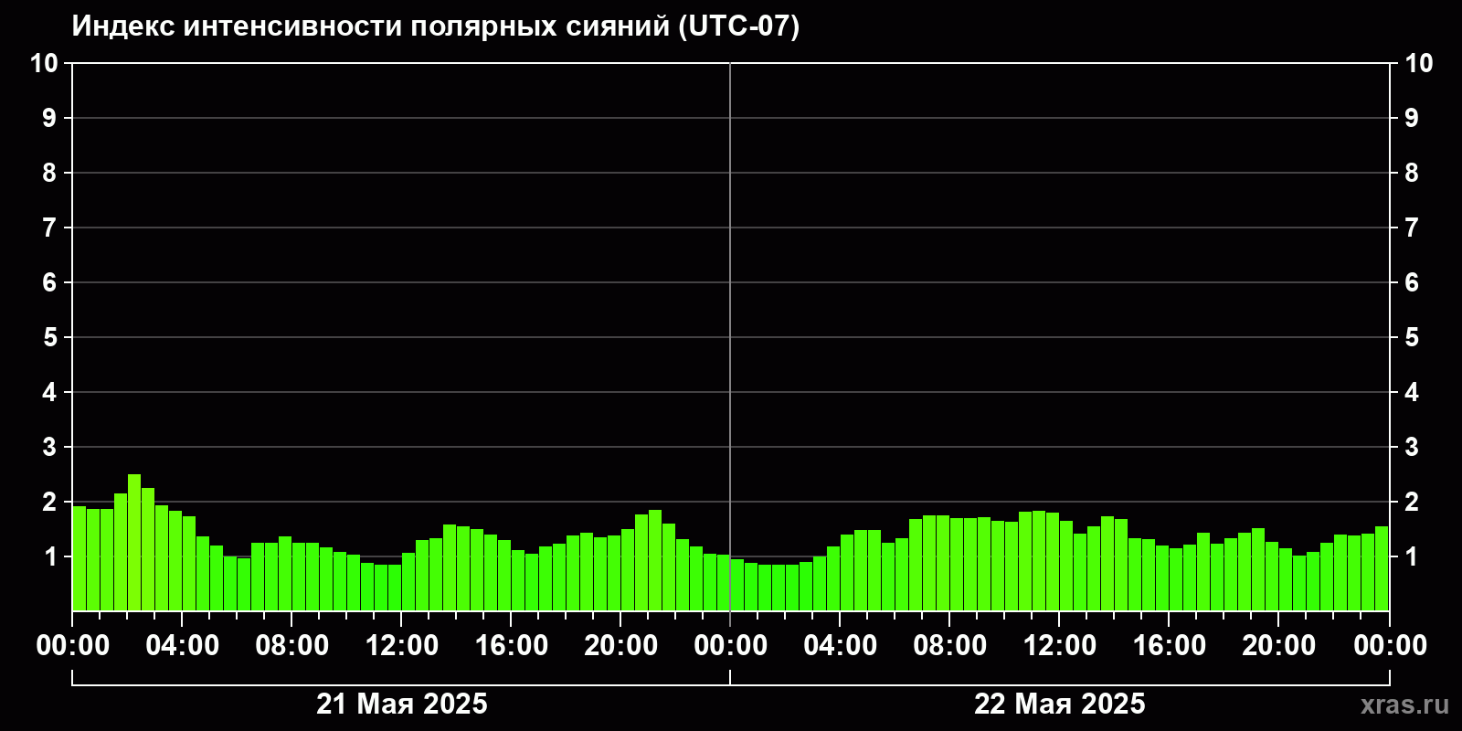Изменения индекса интенсивности полярных сияний с 2025-05-21 по 2025-05-22 по местному времени