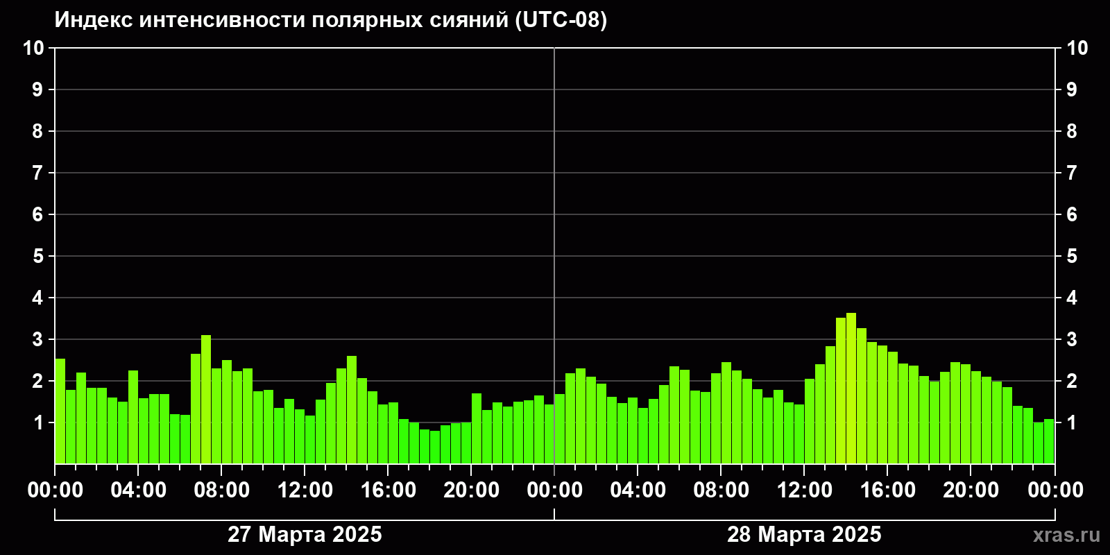 Изменения индекса интенсивности полярных сияний с 2025-03-27 по 2025-03-28 по местному времени