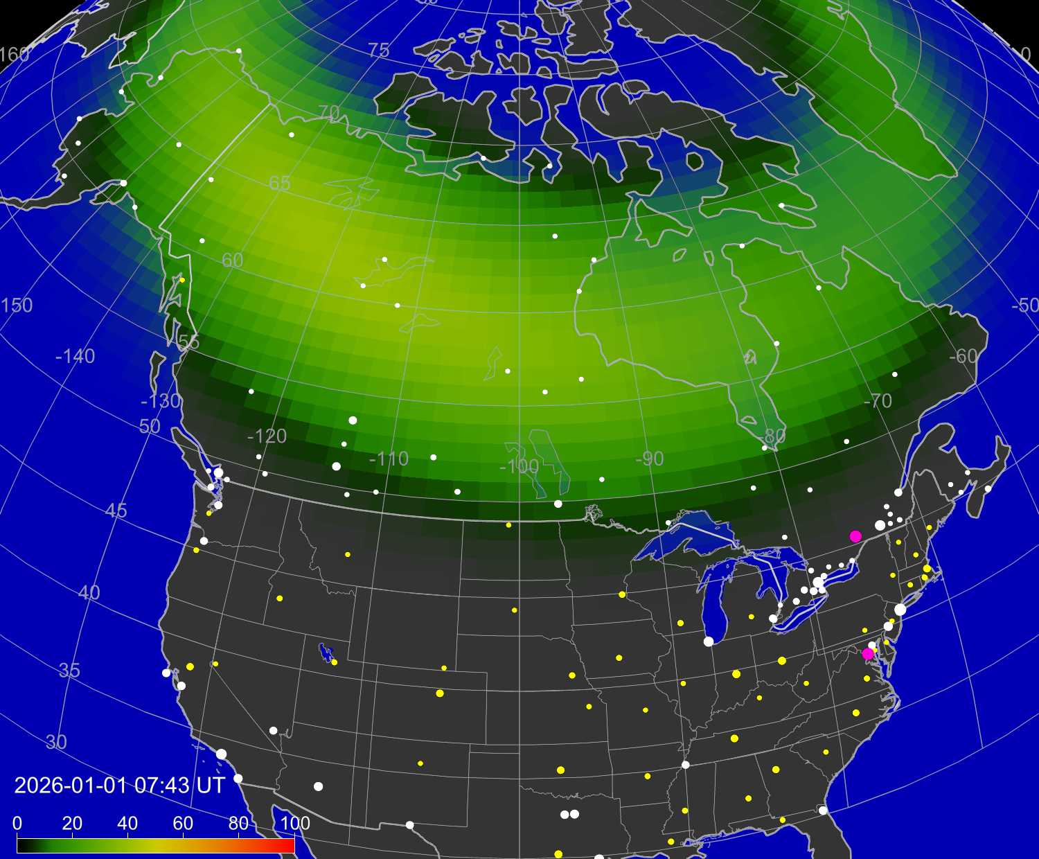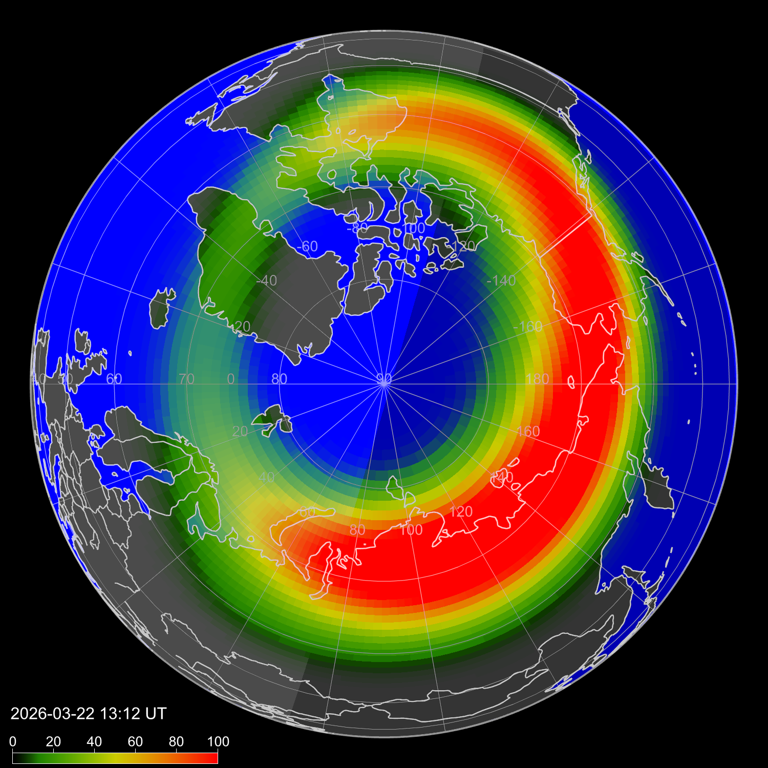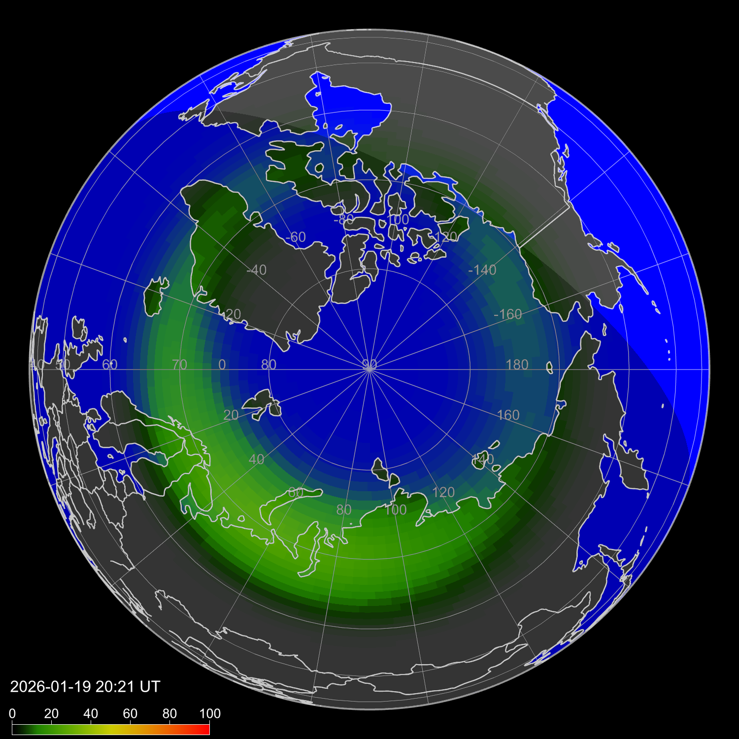 Индекс интенсивности полярных сияний и теоретически возможная широта наблюдений для ночного времени в западном полушарии