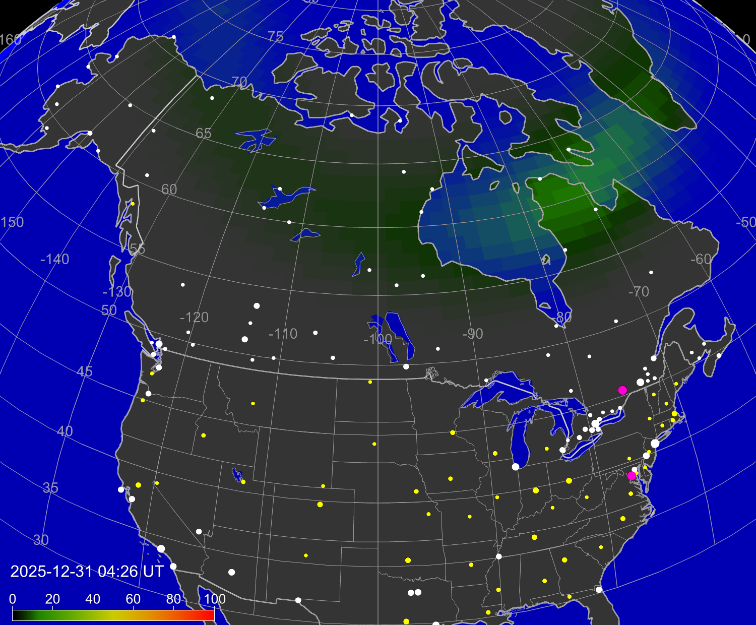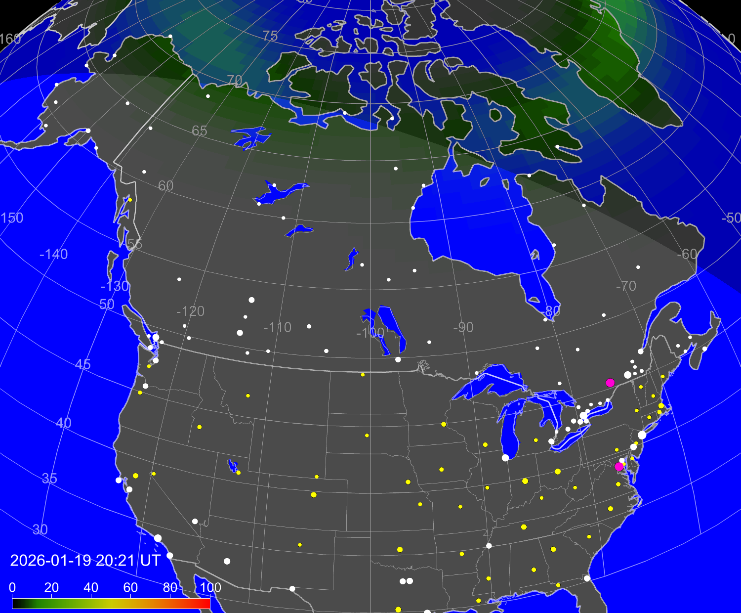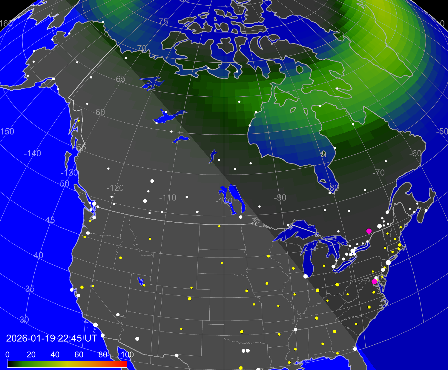 Индекс интенсивности полярных сияний и теоретически возможная широта наблюдений для ночного времени в западном полушарии