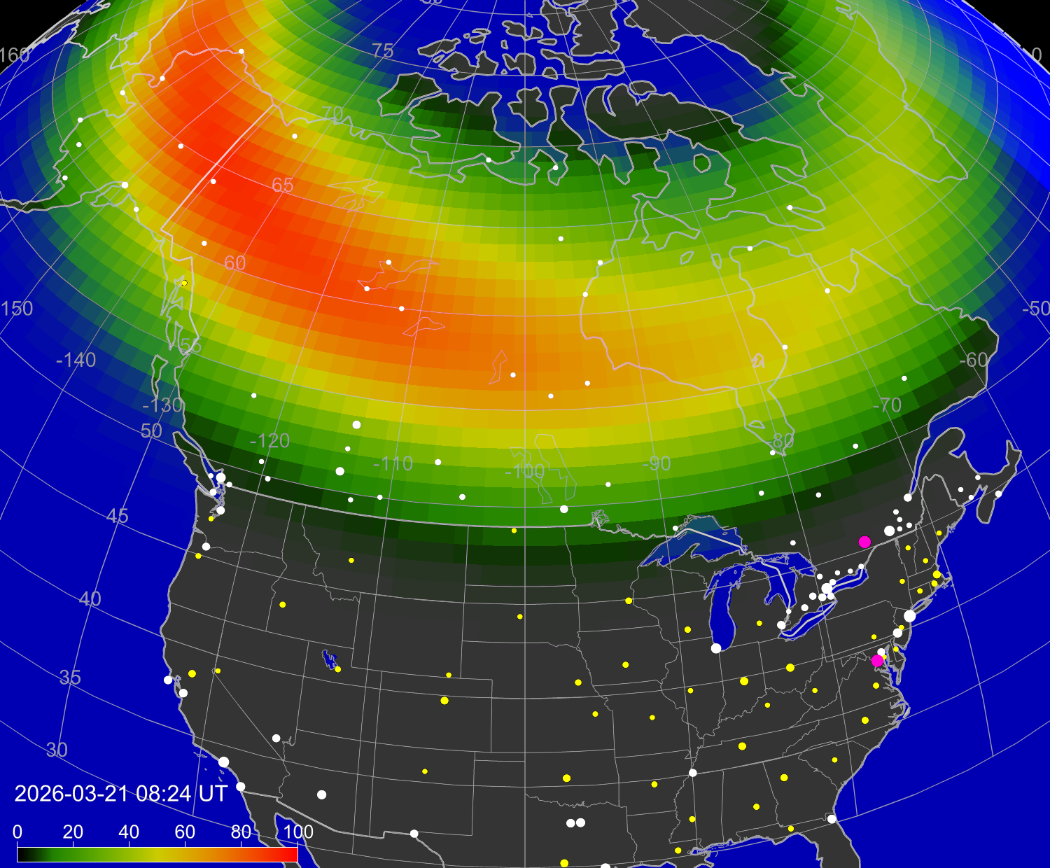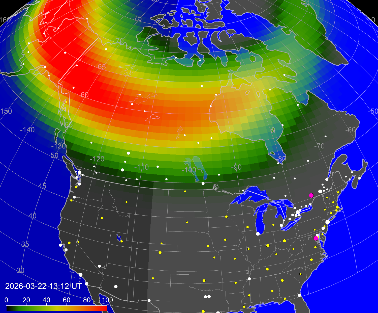 Вероятность полярных сияний в городах Канады