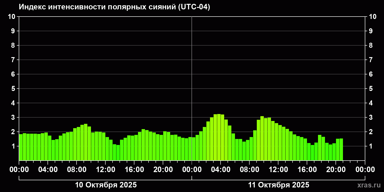 Изменения индекса интенсивности полярных сияний с 2025-10-10 по 2025-10-11 по местному времени