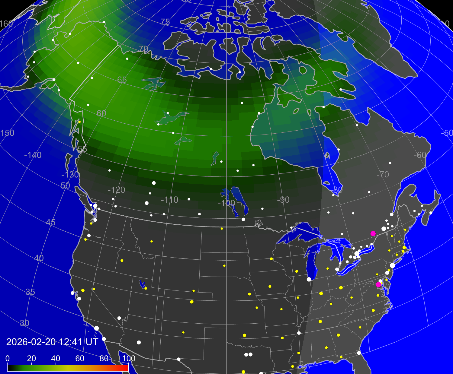 Изменения и часовой прогноз индекса интенсивности полярных сияний с 2026-02-19 по 2026-02-20