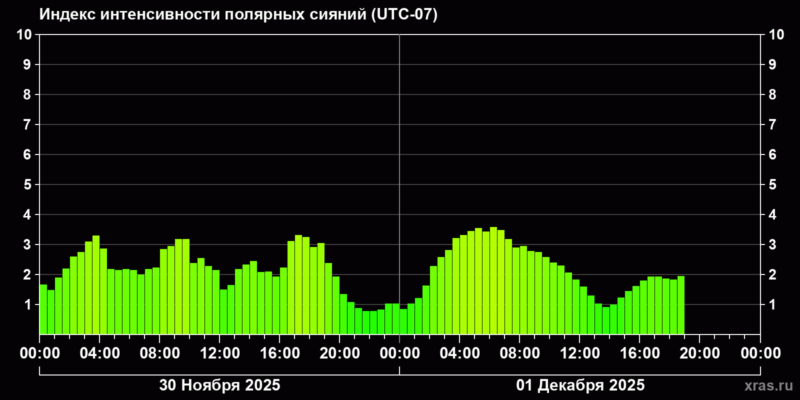 Изменения индекса интенсивности полярных сияний с 2025-11-30 по 2025-12-01 по местному времени