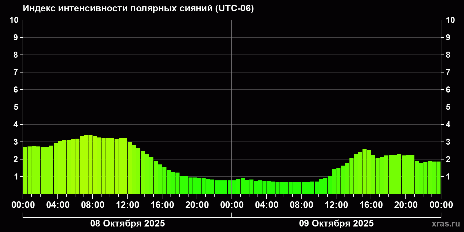 Изменения индекса интенсивности полярных сияний с 2025-10-08 по 2025-10-09 по местному времени