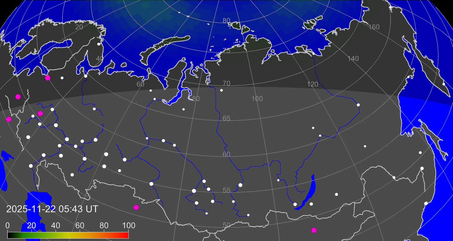 Индекс интенсивности полярных сияний и теоретически возможная широта наблюдений для ночного времени в восточном полушарии