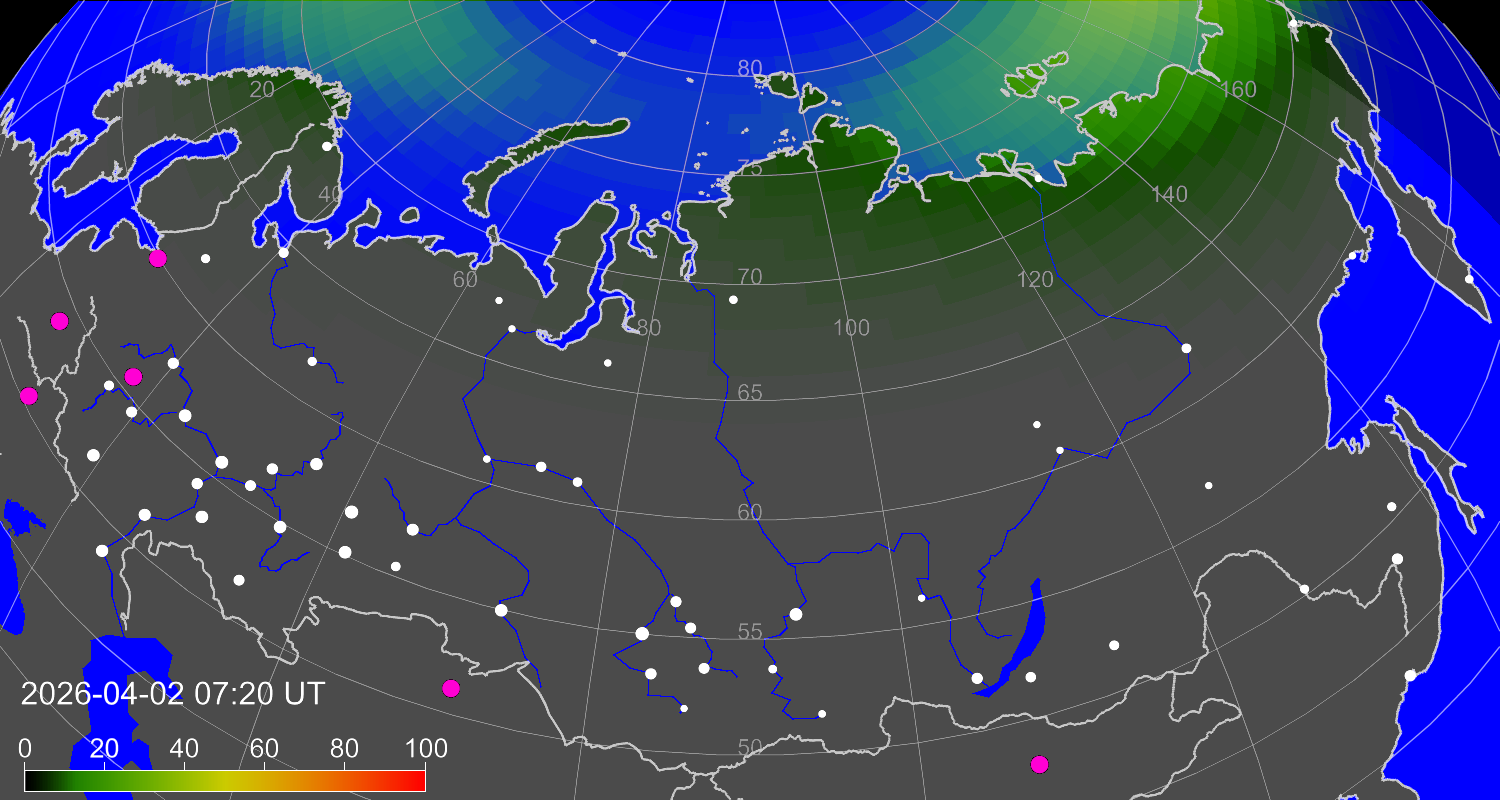 Вероятность полярных сияний в городах Российской Федерации