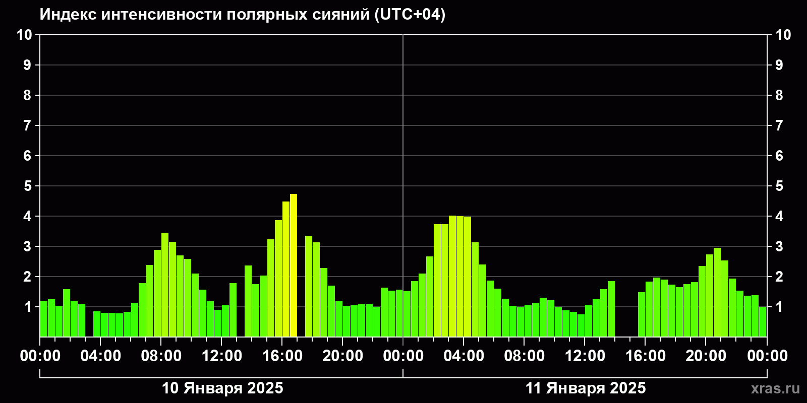 Изменения индекса интенсивности полярных сияний с 2025-01-10 по 2025-01-11 по местному времени