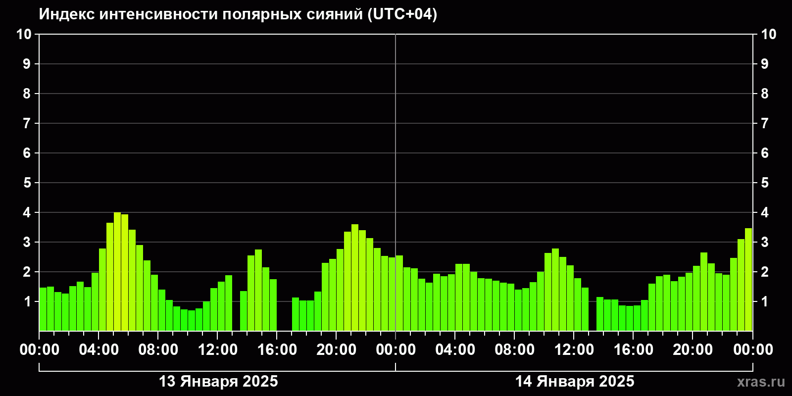 Изменения индекса интенсивности полярных сияний с 2025-01-13 по 2025-01-14 по местному времени