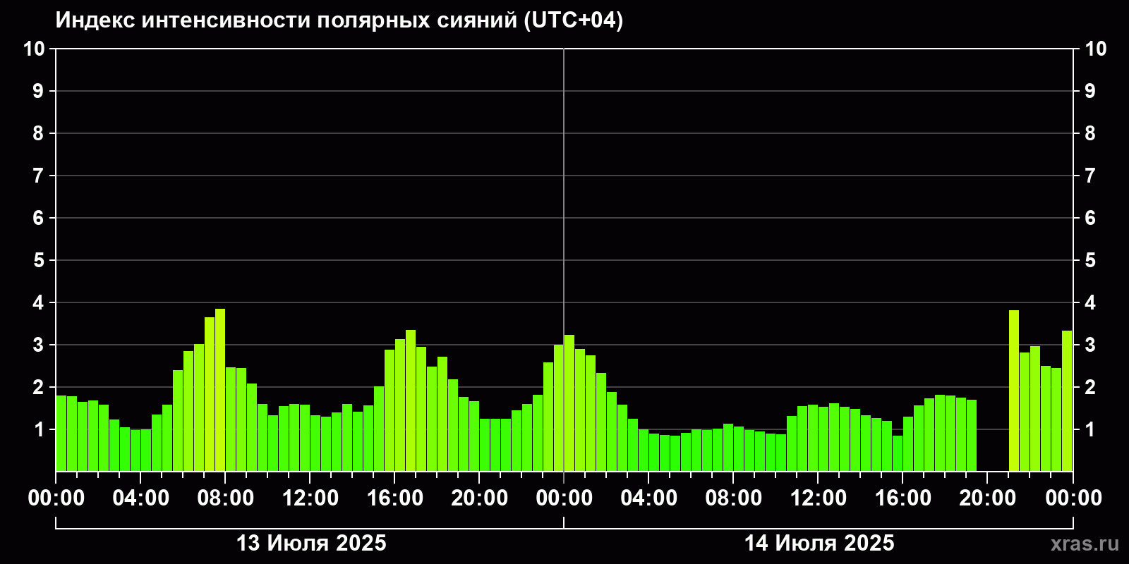 Изменения индекса интенсивности полярных сияний с 2025-07-13 по 2025-07-14 по местному времени