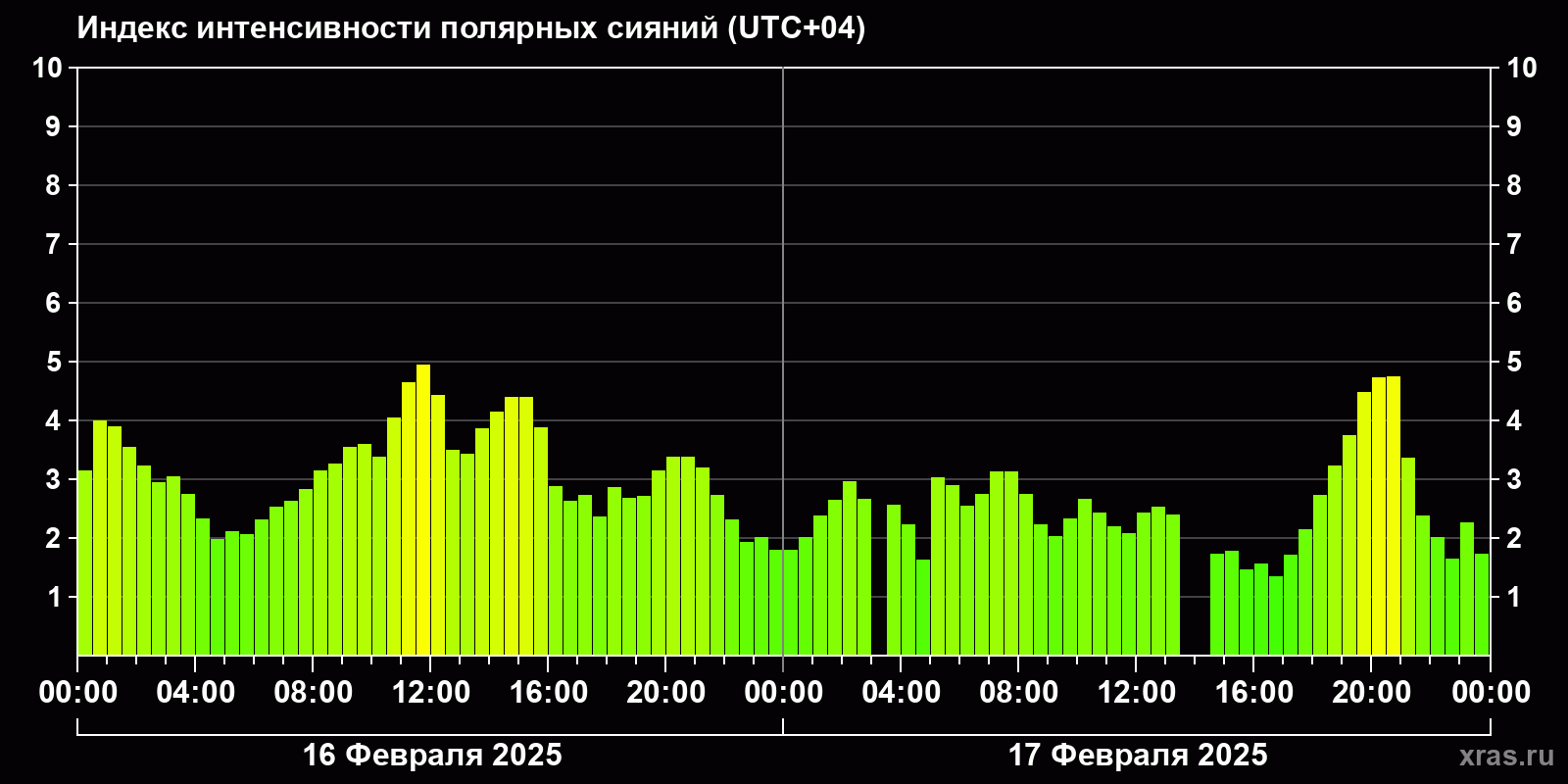 Изменения индекса интенсивности полярных сияний с 2025-02-16 по 2025-02-17 по местному времени