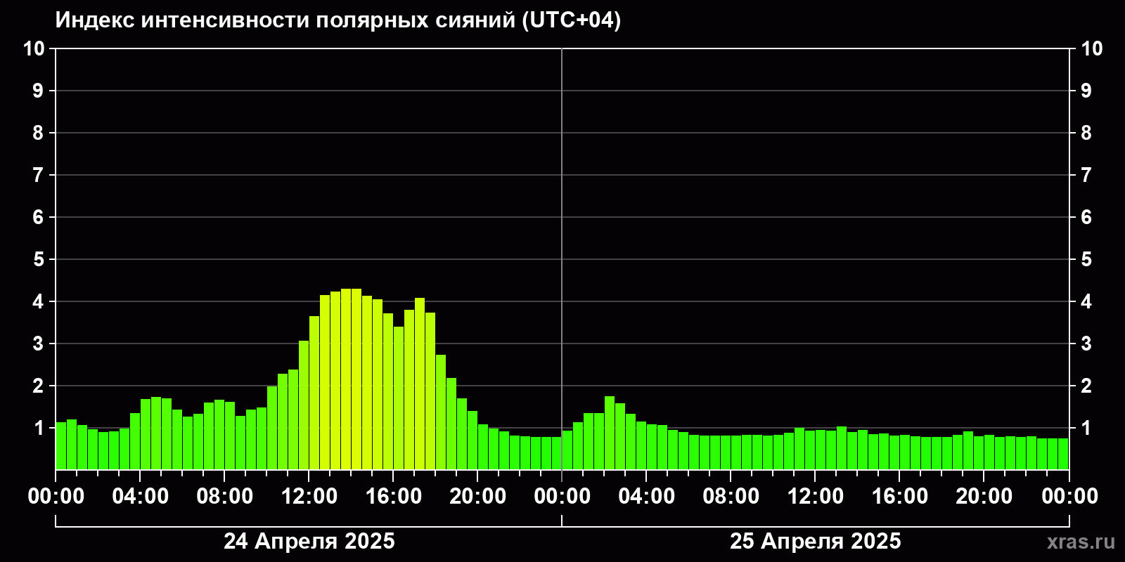 Изменения индекса интенсивности полярных сияний с 2025-04-24 по 2025-04-25 по местному времени