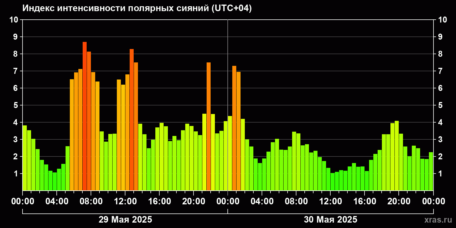 Изменения индекса интенсивности полярных сияний с 2025-05-29 по 2025-05-30 по местному времени