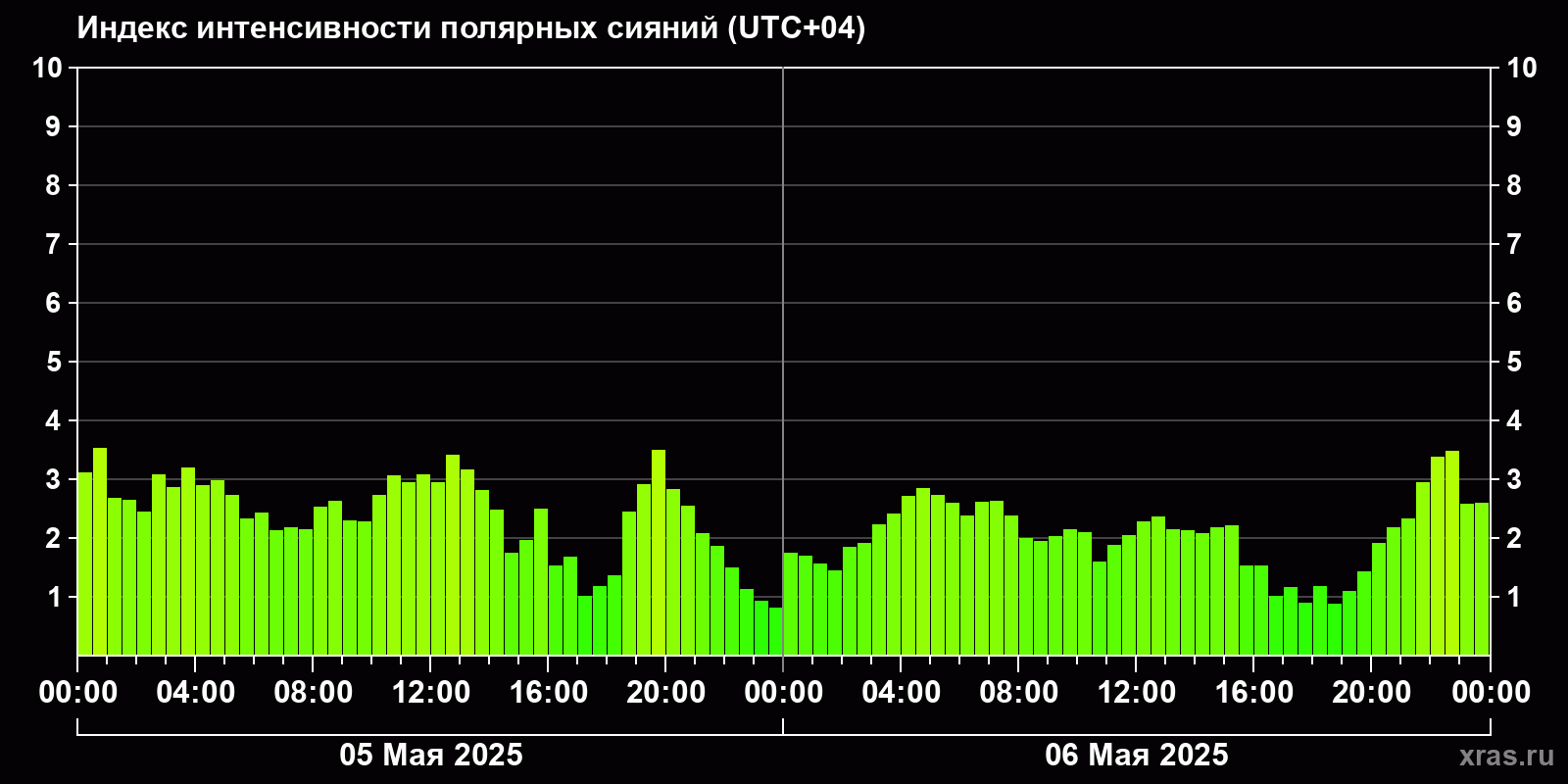 Изменения индекса интенсивности полярных сияний с 2025-05-05 по 2025-05-06 по местному времени