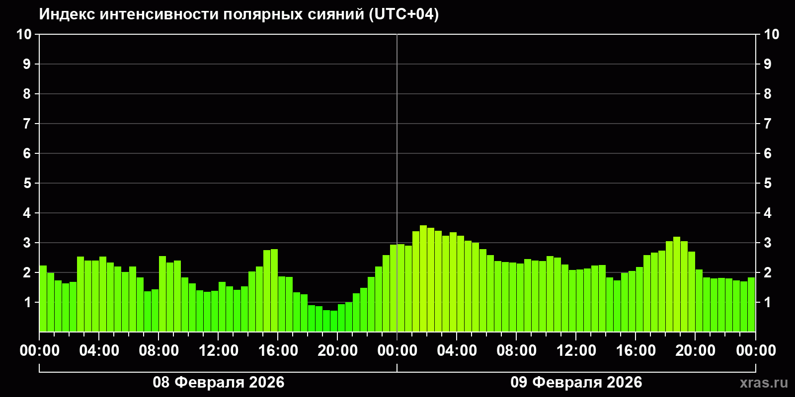 Изменения индекса интенсивности полярных сияний с 2026-02-08 по 2026-02-09 по местному времени