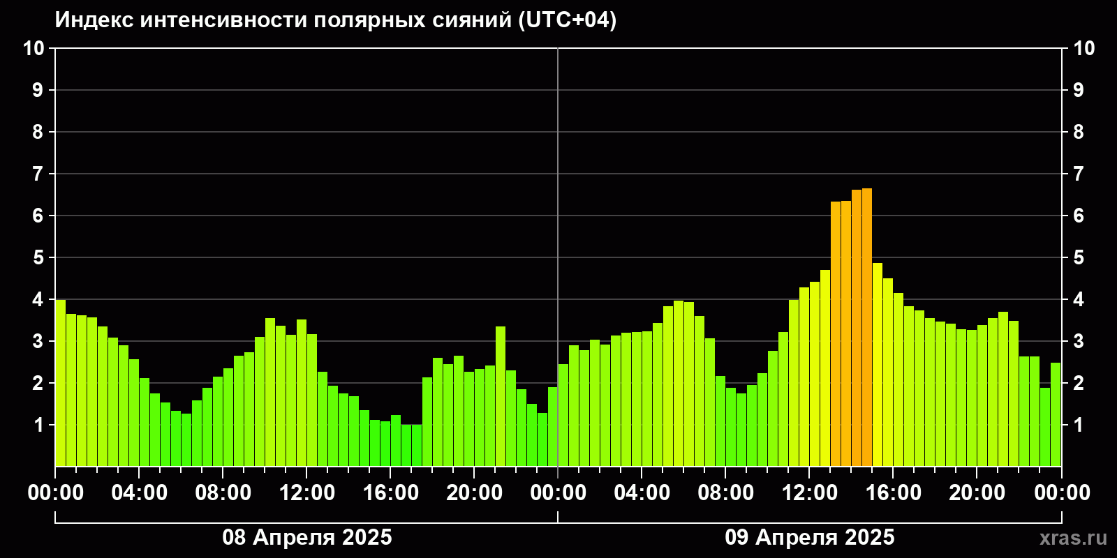 Изменения индекса интенсивности полярных сияний с 2025-04-08 по 2025-04-09 по местному времени