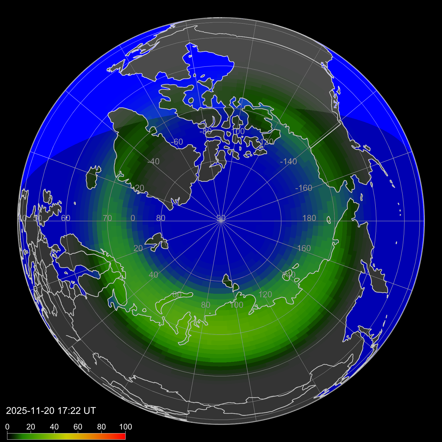 Изменения и часовой прогноз индекса интенсивности полярных сияний с 2025-11-19 по 2025-11-20