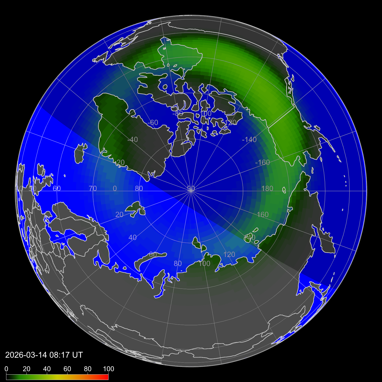 Изменения и часовой прогноз индекса интенсивности полярных сияний с 2026-03-13 по 2026-03-14