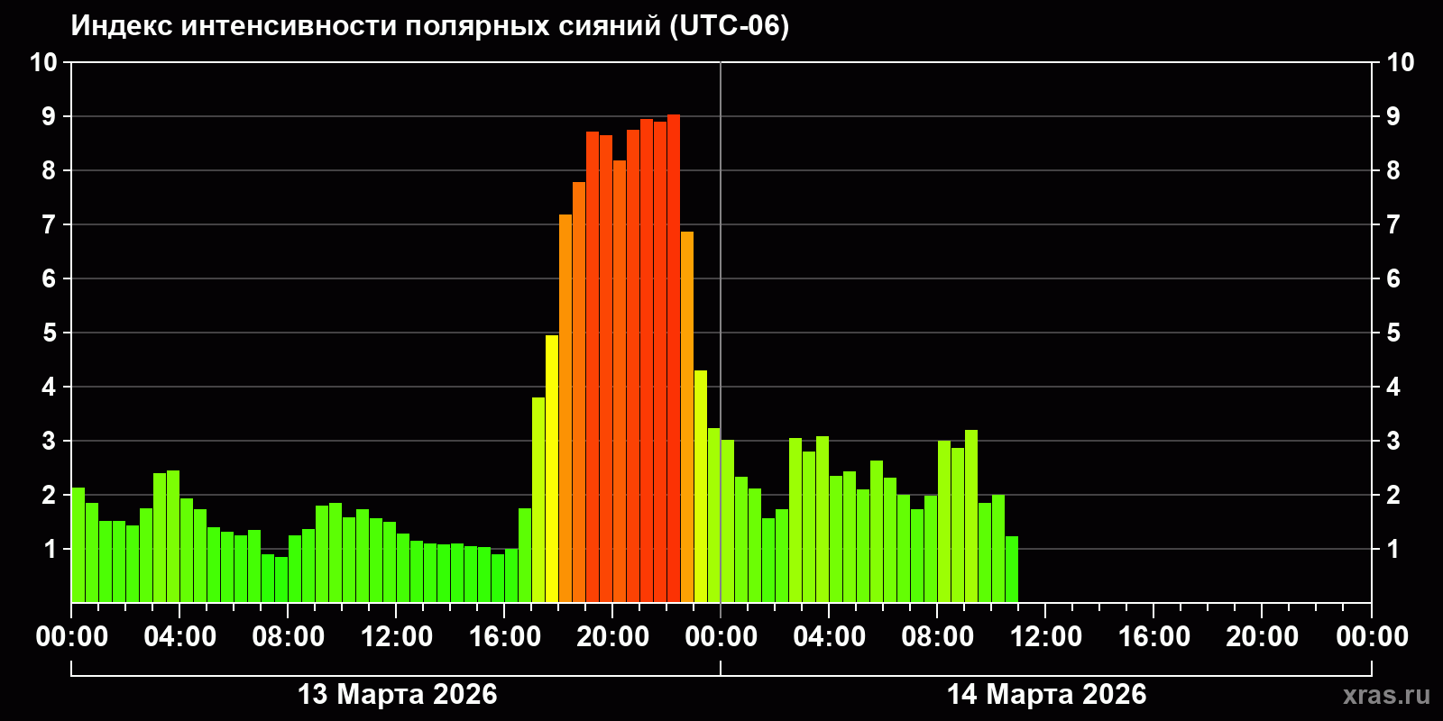 Изменения индекса интенсивности полярных сияний с 2026-03-13 по 2026-03-14 по местному времени