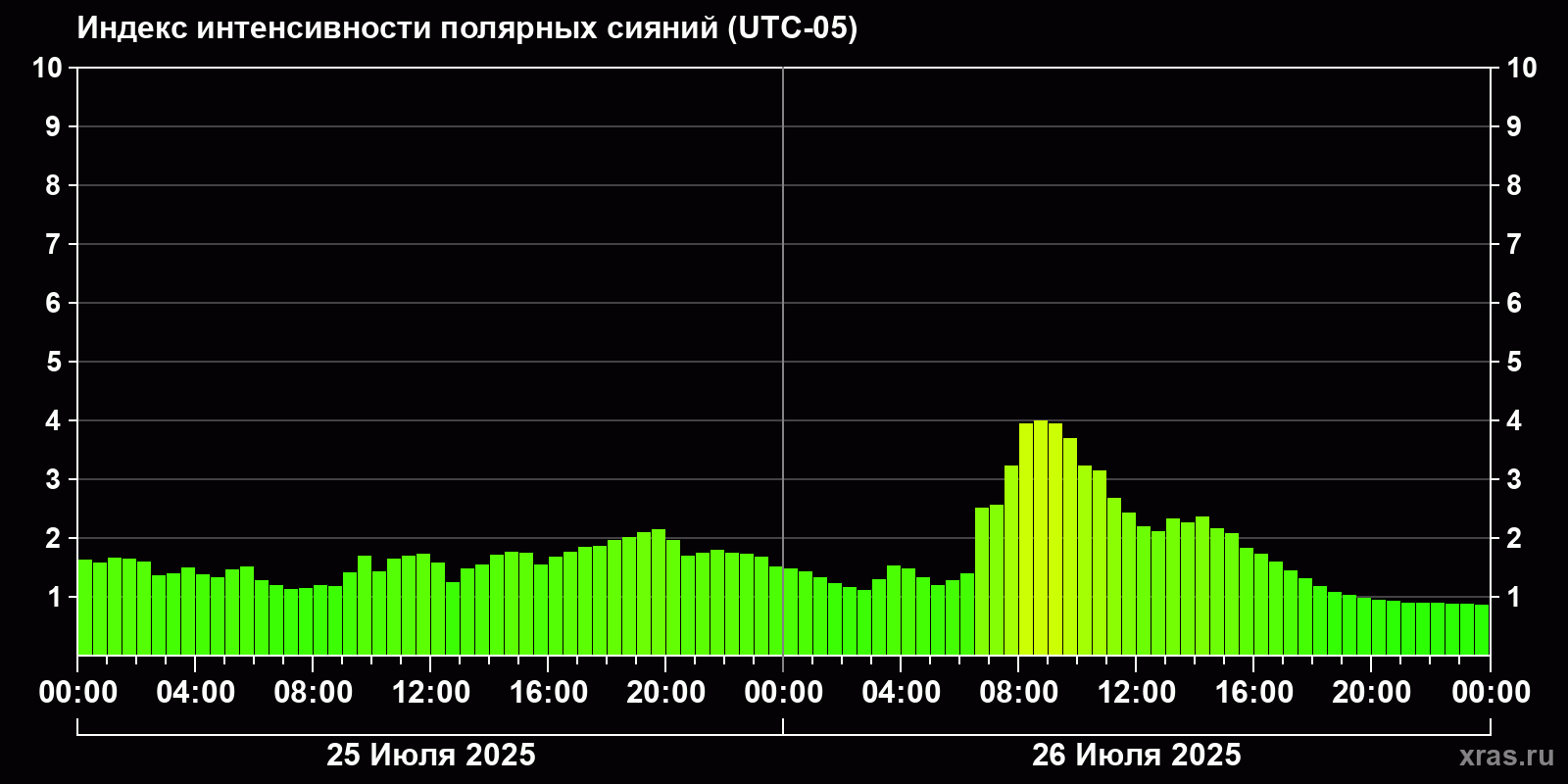 Изменения индекса интенсивности полярных сияний с 2025-07-25 по 2025-07-26 по местному времени
