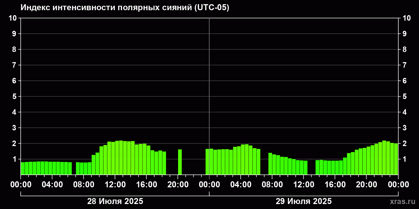 Изменения индекса интенсивности полярных сияний с 2025-07-28 по 2025-07-29 по местному времени