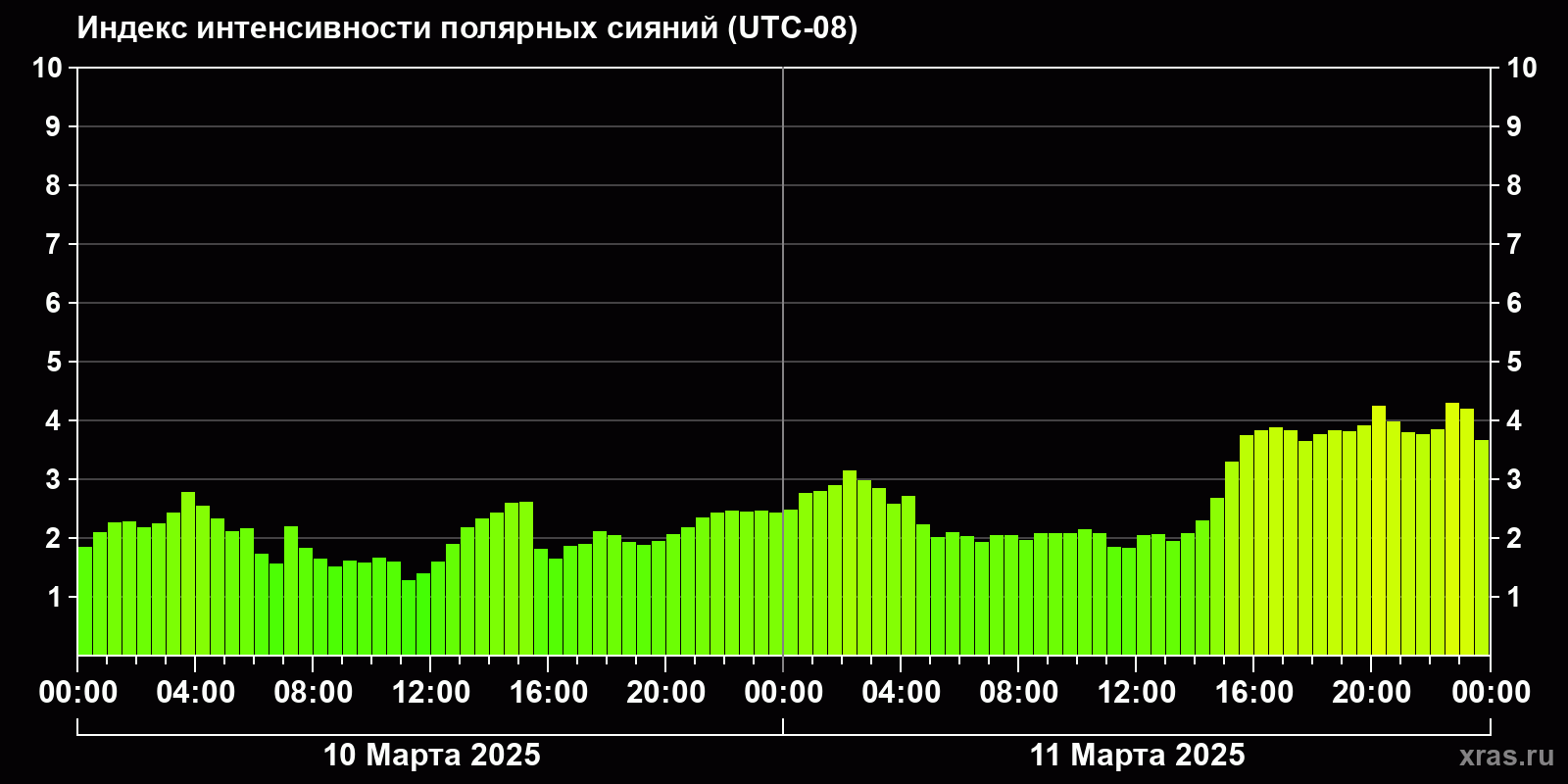 Изменения индекса интенсивности полярных сияний с 2025-03-10 по 2025-03-11 по местному времени