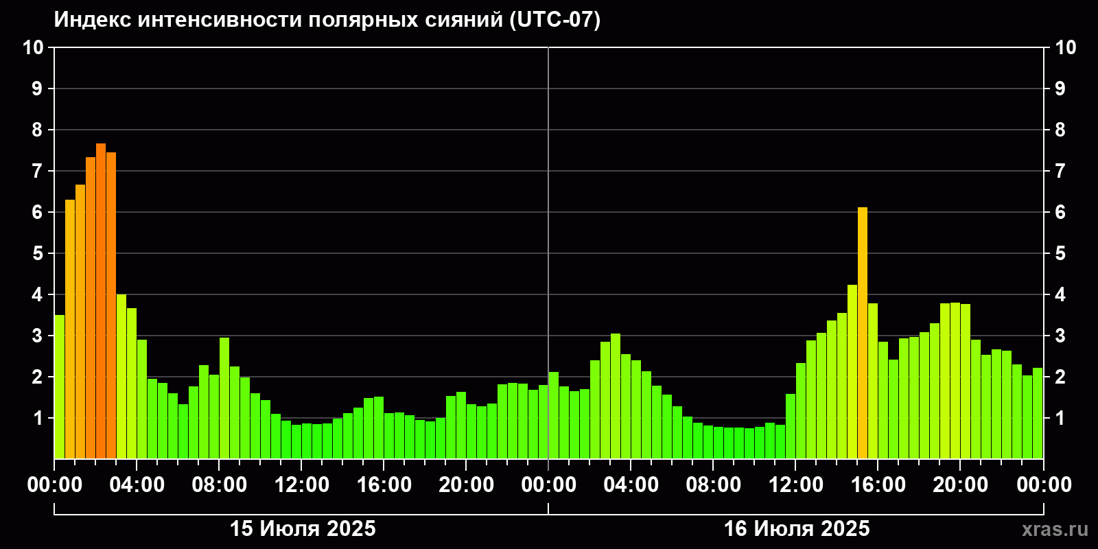 Изменения индекса интенсивности полярных сияний с 2025-07-15 по 2025-07-16 по местному времени